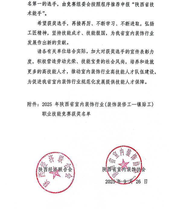 关于对2025 年陕西省室内装饰行业(装饰装修工-镶贴工)职业技能竞赛获奖选手和单位进行表彰的通报