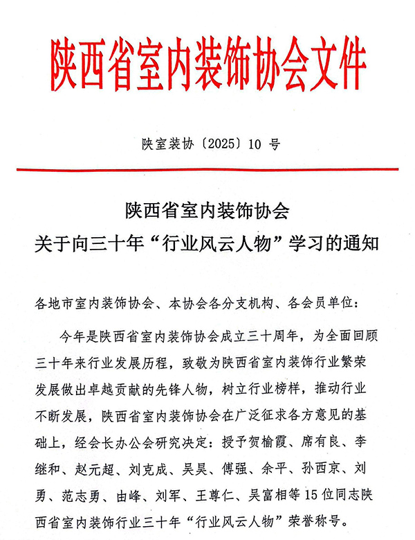 | 陕西省室内装饰协会关于向三十年“行业风云人物”学习的通知 |