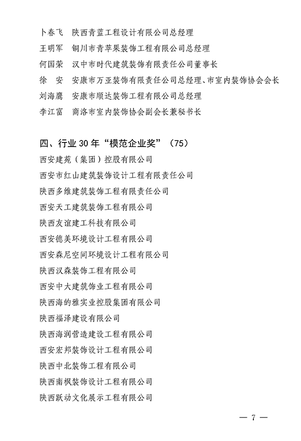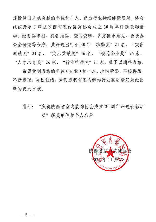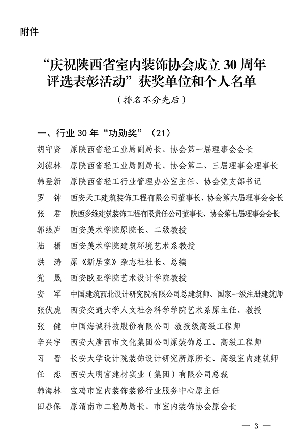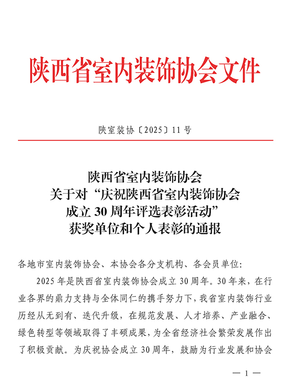 陕西省室内装饰协会关于对“庆祝陕西省室内装饰协会成立30周年评选表彰活动”获奖单位和个人表彰的通报
