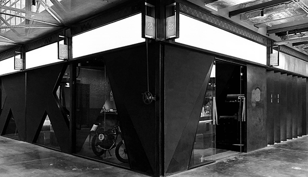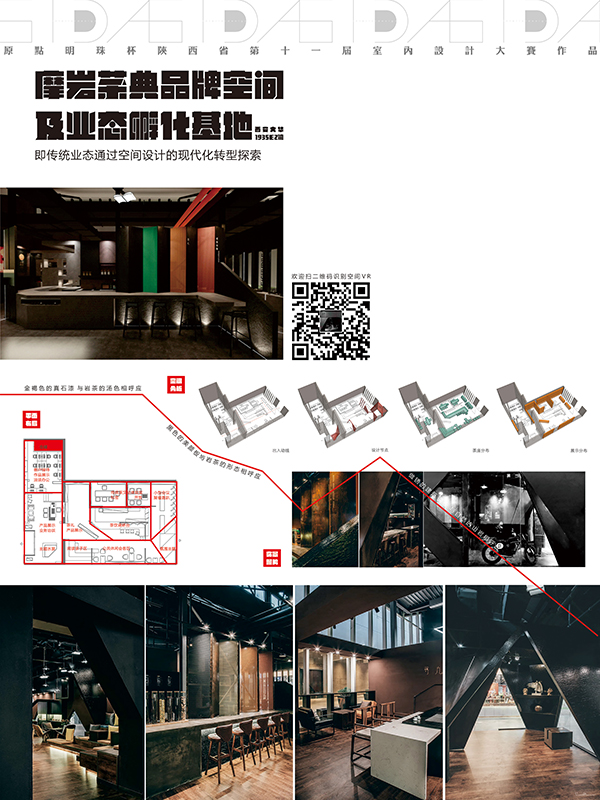岩茶顾名思义,生长于高崖峭壁之上,对自然环境的要求极高,本案第一视觉元素选用岩石的高耸、倾斜、包裹感来划分空间,用实体隔墙制造高大挺拔的自然空间,循着岩石生长的纹理及排列特征,形成空间的不同密度和层次。摩岩茶典位于西安大华1935的老工业厂房里,是武夷岩茶品牌空间及业态孵化基地。为了满足功能需求,将传统茶店的展示融入到岩茶主题空间中,营造出一个时尚休闲的多功能场域。以工业厂房分割,工业风格突出,运用金属、类石材材质及其做旧、创造肌理等手法。