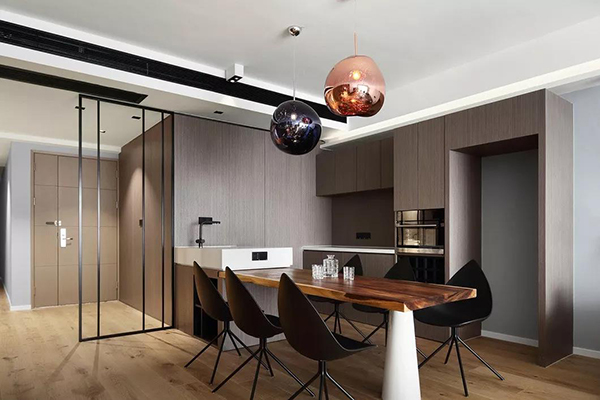 餐厅延续了客厅的整体效果,同时又展现出自己的新意,餐桌其实是水吧与一整块胡桃木衔接而成,这块区域不仅用于就餐,平时也可以在此用电脑办公,餐桌岛台一体,是设计师设计好后找厂定制的。