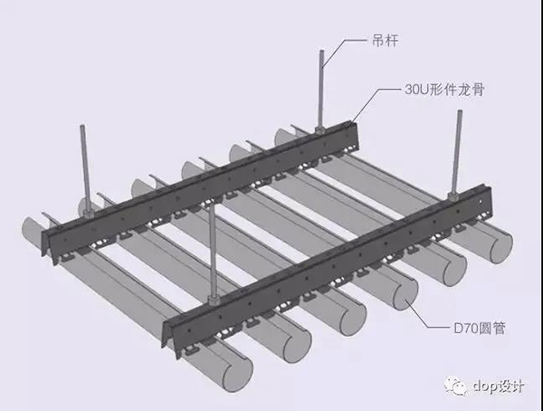 下面通过部分图片及节点大样,对金属板天花的一些形式、安装工艺进行展示——