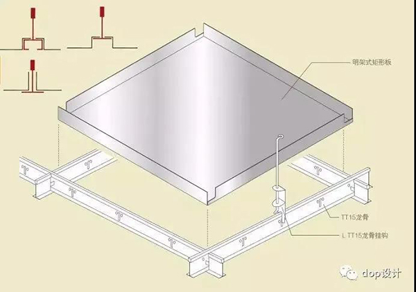 金属板天花根据面板的材质、板块形式、尺寸规格等安装工艺基本分为粘贴以及专用龙骨卡槽等连接方式,其中粘贴工艺由于工艺做法基本类同于墙面,本篇文章主要对模块化的金属板配合专用龙骨进行安装的金属板工艺进行说明。