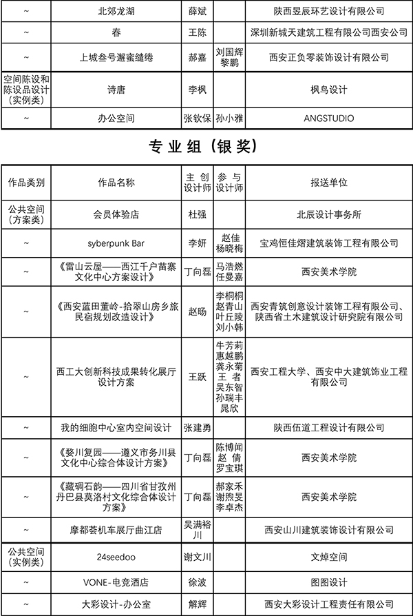 现将陕西省第十二届室内设计大赛评审结果(包括专业组和学生组金、银、铜、优秀、入围奖作品)予以公示,公示期至4月21日,如发现问题请及时与协会秘书处联系,电话:029-88229568 贺小冬。