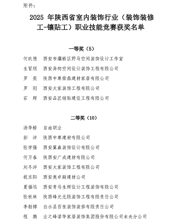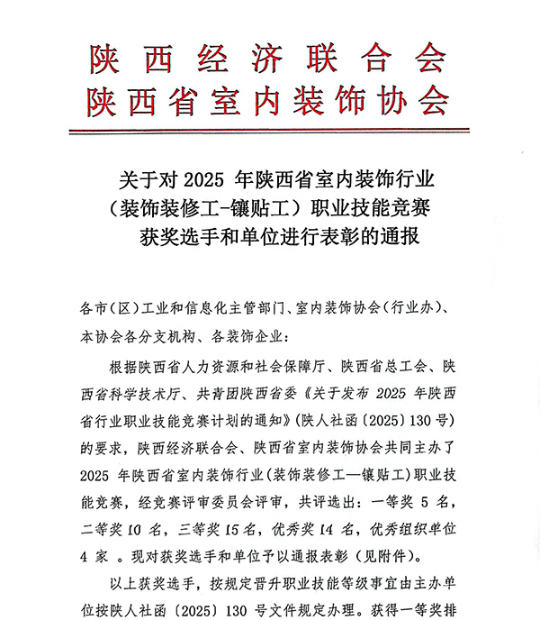 ·关于对2025 年陕西省室内装饰行业(装饰装修工-镶贴工)职业技能竞赛获奖选手和单位进行表彰的通报