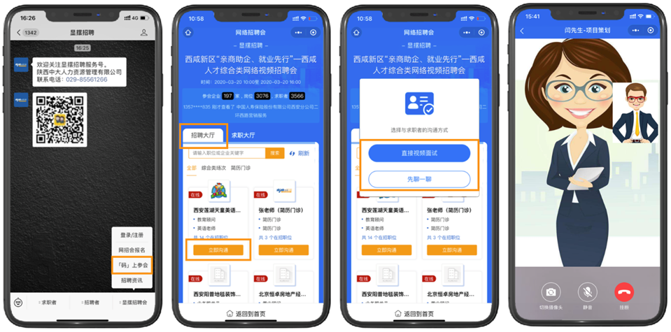 毕业生参会:参会当天进入【显摆招聘】公众号,点击右下角【显摆招聘会】→【码上参会】→识别二维码即可进入【招聘大厅】与社会组织HR在线聊天,发起视频面试。